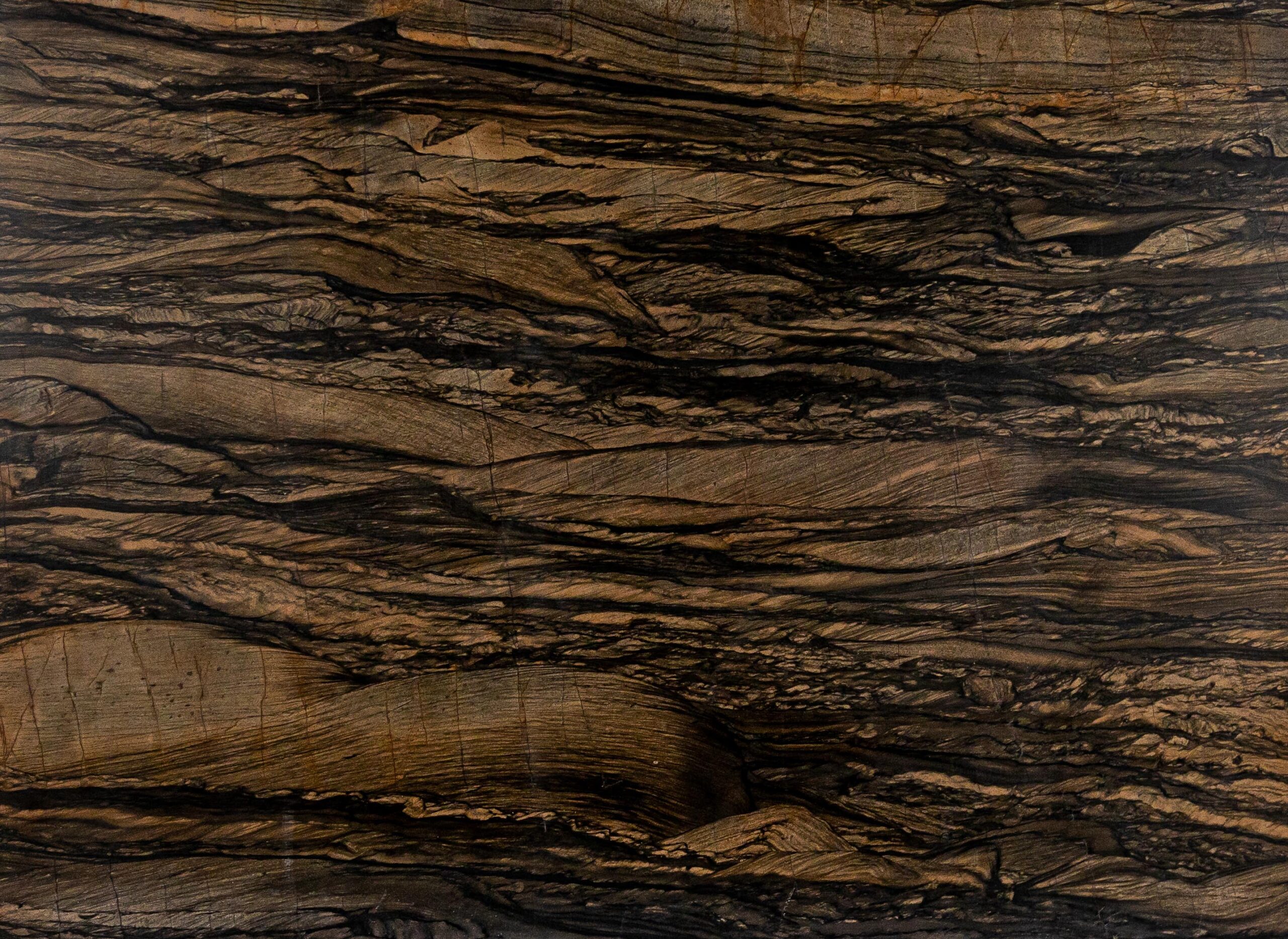 O Quartzito Marrom Sândalos é uma pedra natural encantadora, caracterizada por sua rica mistura de tons marrons e pretos, que formam padrões orgânicos e fluídos.