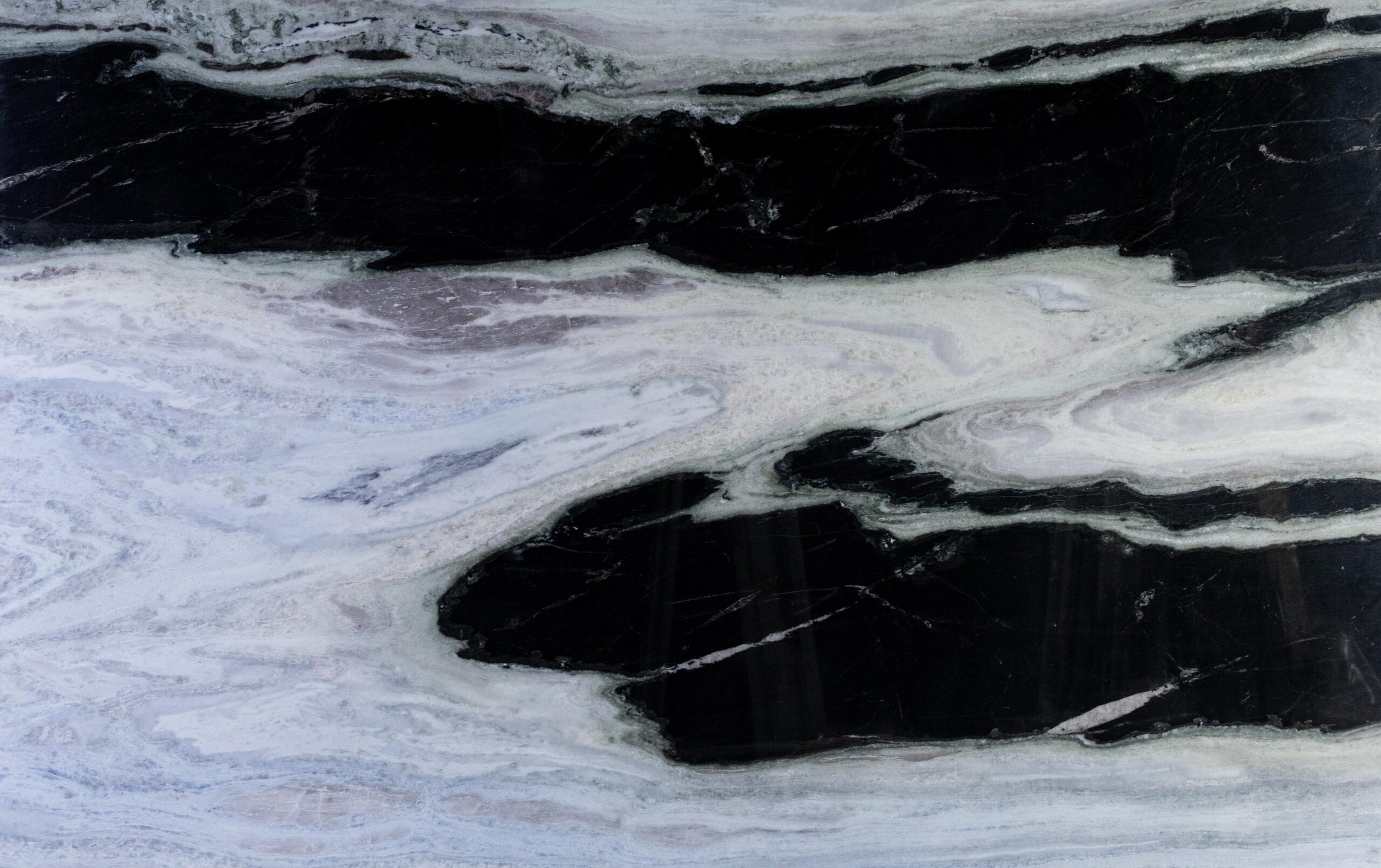 O Mármore Panda é conhecido por seu fundo branco puro atravessado por veios pretos marcantes, que criam um efeito visual impactante e sofisticado.